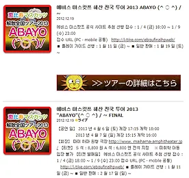 ABAYO 썸네일형 리스트형 JTV뉴비님 PV 스크린샷 130419 약 세달만의 업데이트입니다 전에 작업하신 PV 스크린샷 주소 - http://ebimas.tistory.com/56 JTV뉴비님이 에비스마스캇츠 PV 를 잘 나온 장면들만 뽑아서 스크린샷 작업을 해주셨었는데요 이번에 9집 2곡과 8집앨범중 1절만 있었던 ナイチンゲール 를 해주셨습니다 아바요는 영상을 멈추면 화면이 뭉개지거나 흔들리는 현상때문에 제대로 찍히질 않아서 아바요 자켓촬영 스샷까지 추가하셨습니다 언제나 감사드려요! 사진을 클릭하면 원본사이즈로 나옵니다 싱글 8집 ナイチンゲール PV 싱글 9집 ABAYO PV (+자켓촬영) 싱글 9집 アルバム PV 더보기 13/04/06 파이널콘서트전야제 & 하이터치회(6,7일) 후기 JTV 뉴비님이 직접 작성하신 마이하마 파이널콘서트 전야제 후기입니다 원본은 http://blog.naver.com/quickdory 에 가시면 보실 수 있습니다 그대로 옮기니까 에러가 나서 메모장 거쳐서 붙여넣었기때문에 원본이랑 살짝 다른곳이 있을 수 있습니다 양해바랍니다 4월6일 파이널 전야제콘서트&하이터치회 + 4월7일 파이널 하이터치회 후기입니다 (영상포함)(스압주의) 안녕하세요 이번 마이하마 파이널에 참가하기위해 거침없이 연차와 휴가를 써버린 JTV뉴비 입니다 항상 방문객(manboy님. 이하방문객님)님 블로그를 통해서 댓글로만 활동했는데 글쓰려니깐 쑥스럽군요 이나이먹고 일본까지가서 팬질을 하고왔습니다 방문객님의 에비마스 팬블로그에 모이시는 팬분들께서 이번 파이널콘서트에 관심도 많으셨고 이렇게 .. 더보기 마스캇츠 졸업앨범 오리콘차트 데일리 3위로 시작!! 에비스마스캇츠 졸업앨범이 오리콘 데일리차트 3위로 스타트를 끊었습니다 4월 3일 발매한 앨범들이 판매량이 많은 앨범들이 아닌것도 하나의 이유긴 하지만 비싼 앨범임에도 불구하고 첫날 5천 5백장을 팔았습니다 과연 꾸준히 판매하여 오리콘차트 위클리 1위라는 마지막 소원을 이뤄 낼 수 있을까요? 그런데 대체 저 2위 앨범은 정체가 뭐죠 더보기 2013. 03. 23 에비스마스캇츠 최근소식 업데이트 1. 아사미 유마 한달만의 트위터 업데이트 현재 몸상태악화로 방송, 콘서트 전부 쉬고있는 아사미유마의 트위터가 한달만에 업데이트 되었습니다 뭔가 실종되었다던가 소식불명같은 루머가 나오고있는가보군요! 잘 있습니다 (웃음) 계속 요양중이지만 마스캇츠의 라스트 라이브에 나올 수 있도록 노력하고있으므로 기대하고있습니다. 조금만 더 기다려주세요! 5년간 방송을 쉰 적이 없었는데 마지막 방송까지 못나온것으로 보입니다. 빨리 쾌차해서 마이하마 파이널에서라도 건강한 모습을 다시 볼 수 있었으면 좋겠습니다. 2. 4/6, 4/7 파이널공연 입석표를 판매 마이하마 파이널 공연같은경우는 나오자마자 몇십분만에 매진이 되었었는데요 팬들에게는 희소식이 나왔습니다 3월 25일 (월) 12:00 부터 4월 1일까지 파이널콘서트의 입.. 더보기 ABAYO 뮤직비디오 파헤치기 일단 이 글은 중국 오네마스 팬사이트에서 아이디어를 빌려온것임을 밝힙니다 5년동안 마스캇토시리즈를 촬영하면서 수많은 캐릭터들이 나왔다. 라스트싱글 'ABAYO'의 뮤직비디오에서는 그 수많은 캐릭터들중에 인기있었던 몇몇 캐릭터들이 나온다. 그 의상들이 어디서 나오는지 확실히 알고 다시 뮤직비디오를 본다면 전에 못느꼈던 깨알재미를 느낄 수 있을것이다. 의상과 캐릭터들이 어디서 나왔었는지 어떤유닛에서 나왔는지 알아보도록 하겠다. 1. 뮤직비디오 0분 20초대 오네다리마스캇토 SP 중반부터 바뀌어 현재까지 입고있는 마스캇츠 유니폼 2. 0분 28초~30초 왼쪽에서 오른쪽으로 오가와 아사미 - 헤라클레스 쵸이토마스캇토 후반부부터 등장 1집 정규앨범 안도아이카 - 프레디 머큐리 오네다리마스캇토 44회 미스 수염녀 .. 더보기 에비스마스캇츠 ABAYO 오리콘 데일리차트 18위로 스타트 에비스마스캇츠의 라스트싱글 'ABAYO' 가 발매되었습니다. 데일리 18위로 스타트를 끊었습니다 좋지않네요.. 내일까지도 데일리 10위를 못넘긴다면 위클리 10위도 없다고 봐야겠죠.. 3위까지는 판매량이 대충 표시되는데 3위가 1만 4천장정도였습니다. 최고 판매량과 순위를 기록한 역주아이돌때와는 사뭇 다른 결과가 나올것 같습니다.. 더보기 YOUKU 메인에 에비스마스캇츠 ABAYO 뮤직비디오가! YOUKU(유쿠) 는 중국에서 가장 큰 동영상 스트리밍 사이트중 하나입니다 그 유쿠에 메인에 에비스마스캇츠 싱글 9집 ABAYO가 떴습니다 정확히 말하자면 YOUKU 음악탭에 뜬거긴 하지만요 YOUKU에서 음악탭을 누르면 바로 나옵니다 빅뱅 2am 등등도 보이는군요 그 효과인지 ABAYO 뮤비는 현재 11만힛을 넘었습니다. 중국팬들과 CD구매는 관계없다는것을 지금까지 계속 확인했으니 중국사이트 메인에 소개되었다고 판매에 영향은 없을 것 같기는 합니다. 3월 6일 발매인데 오프라인은 벌써 판매가 시작되었나봅니다 트위터랑 블로그에 팬들의 구매트윗과 멤버들의 매장 인증샷이 계속 올라오네요 더보기 ABAYO (아바요) 뮤직비디오 릴리즈 (1절버젼) ABAYO PV 1절버젼입니다. 콘서트에서 이미 몇번 불러서 선공개해도 별 상관 없으려나봅니다 팬들이 이미 일주일전에 코드도 대충 따서 유튜브에 